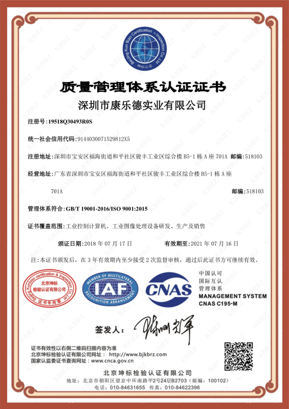 深圳康樂德通過GB/T 19001:2016 /ISO9001:2015認證